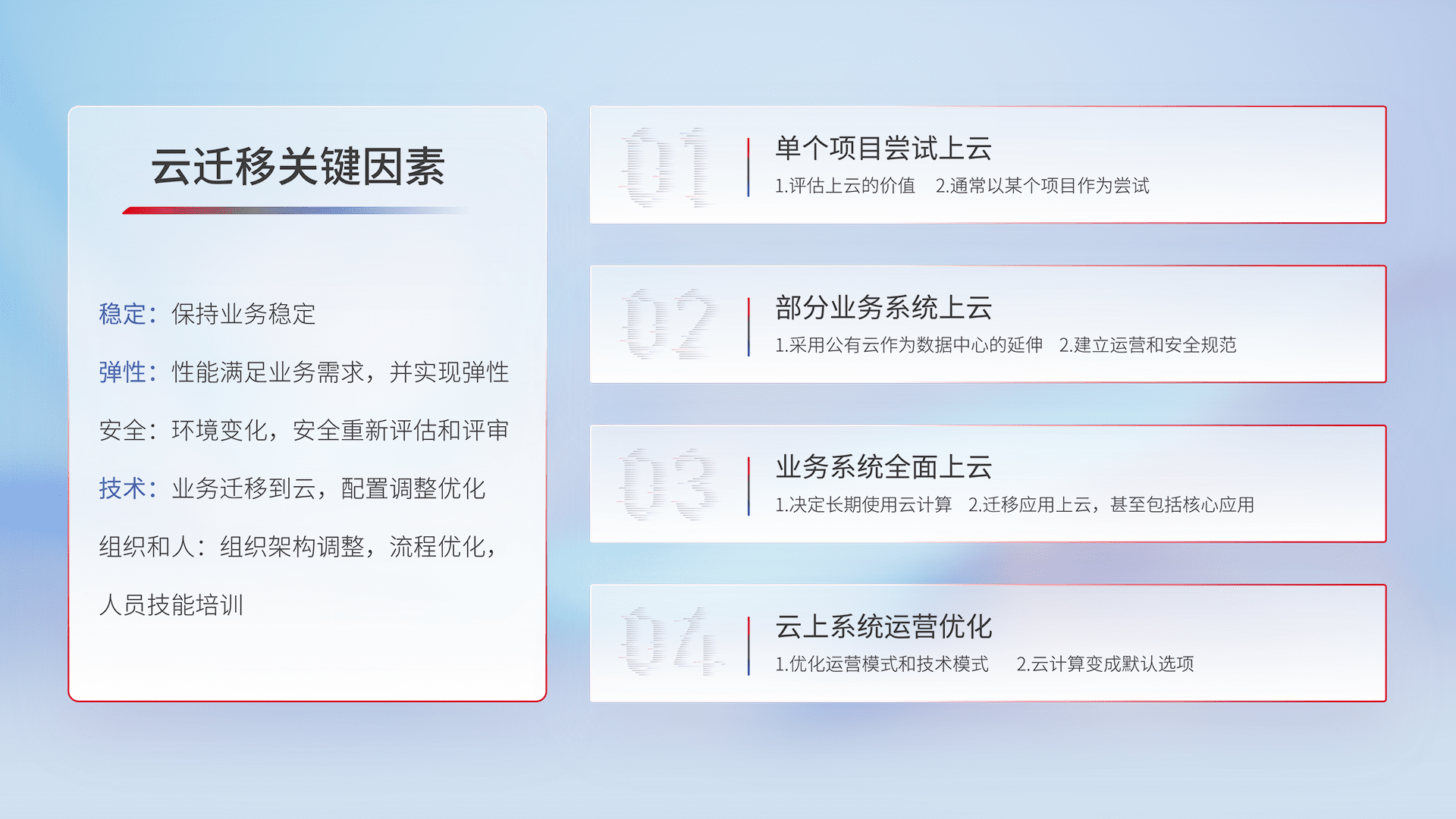 结合实际业务,,从规划设计、、、、云平台选型、、、云原生改造、、数据迁移、、集成交付,,,迁移全过程为客户识别最佳上云路径,,,,做好风险识别管理,,设计网络架构、、身份权限、、安全审计合规、、、操作审计、、、日志审计、、、监控告警策略、、多站点容灾设计等,,对云上基础设施进行整体规划,,,,提升IT治理水平,,,以满足弹性、、、高可用、、、高性能的需求。。。